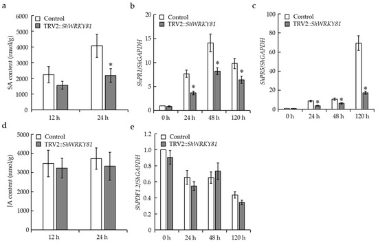 To investigate whether the defense hormones SA and JA contribute to ShWRKY81-mediated resistance to On-Lz, SA and JA levels were measured in ShWRKY81-silenced LA1777 and control seedlings at 12 and 24 hpi with On-Lz infection. In the control group, SA levels at 24 hpi were significantly increased to 182.5% of those at 12 hpi, reaching 4068.1 nmol/g (Figure 8a), while in the ShWRKY81-silenced group, SA levels were maintained at the same level at 12 and 24 hpi (Figure 8a). In addition, SA levels at 24 hpi in the control group were significantly higher than those in the ShWRKY81-silenced group (Figure 8a). In both the control and ShWRKY81-silenced group, JA levels at 12 and 24 hpi with On-Lz did not exhibit a significant difference (Figure 8d).