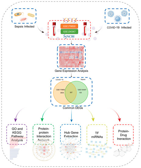 Although it presents important differences in pathogenesis, COVID-19 shares many similarities with sepsis in many aspects. It has been well established that both diseases involve cytokine storms, procoagulant states, toll-like receptor (TLR) signaling, pathogen-associated molecular patterns (PAMPs), and damage-associated molecular patterns (DAMPs) [14,15,16]. Furthermore, manifestations including increased heart rate, respiratory failure, fever, leukopenia, hypotension, leukocytosis, multiorgan dysfunction syndrome, coagulopathy, and septic shock are common to COVID-19 and sepsis [17,18,19,20]. In addition, as part of clinical care, the COVID-19 treatment guidelines, “surviving sepsis campaign”, are being implemented for seriously ill patients [21]. Given the similarities between COVID-19 and sepsis, it is necessary to determine the biological links and potential molecular mechanisms that link the two diseases, which may provide new insights into the pathogenesis of COVID-19 and sepsis and offer potential therapeutic agents for sepsis patients with COVID-19.