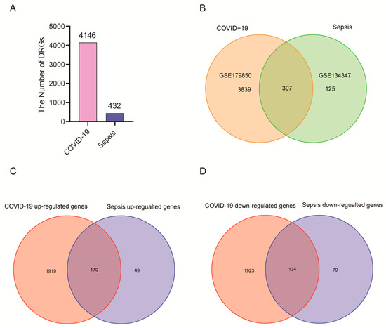 There are two GEO datasets included in the experiment: COVID-19 (GSE179850) and sepsis (GSE134347). (A) In a histogram, the number of genes that are differentially expressed between COVID-19 patients and sepsis patients. (B) There is an overlap between COVID-19 and sepsis differentially expressed genes. (C) The overlapping up-regulated genes between COVID-19 and sepsis. (D) The overlapping down-regulated genes between COVID-19 and sepsis.