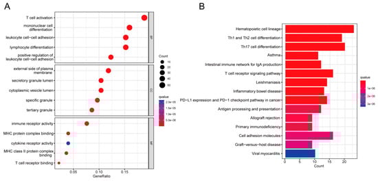 GO and pathway enrichment analyses were performed using the R “clusterProfiler” package to explore the biological features and enriched pathways of common DEGs. The GO database was used as the annotation source to perform GO analysis of three aspects: biological process (BP), cellular composition (CC), and molecular function (MF). We present the top five items for each category of GO terms in a bar chart. DEGs are significantly enriched in the regulation of T cell activation as well as mononuclear cell differentiation in biological process (BP) subsets. External side of plasma membrane and secretory granule lumen pathways are enriched in cellular compartment (CC) subsets. Pathways involved in immune receptor activity, MHC protein complex binding, and cytokine receptor activity are enriched in molecular function (MF) subsets (Figure 3A). KEGG is an online database for the systematic analysis of gene function, and reveals the interplay between genes and biological processes [22]. To explore the biological functions and enriched pathways of common DEGs, KEGG enrichment analysis was performed. The top fifteen pathways identified by KEGG pathway analysis are as follows: hematopoietic cell lineage, Th1 and Th2 cell differentiation, Th17 cell differentiation, asthma, intestinal immune network for IgA production, T-cell receptor signaling pathway, leishmaniasis, inflammatory bowel disease, PD-L1 expression and PD-1 checkpoint pathway in cancer, antigen processing and presentation, allograft rejection, primary immunodeficiency, cell adhesion molecules, graft-versus-host disease, and viral myocarditis (Figure 3B). The complete results of GO and KEGG enrichment analysis are shown in Supplementary Tables S4 and S5.