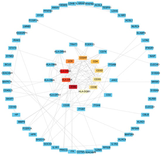 Networks of protein–protein interactions (PPIs) are associated with all kinds of biological processes. Construction of a PPI network will provide insight into molecular processes [64]. Differentially expressed genes were uploaded to STRING (version 11.0) and the median confidence 0.7 was used to construct the PPI network. Cytoscape (v.3.7.2) was used to visualize the PPI network. Both the color and the size of the nodes indicate the score calculated using degree topological analysis methods.