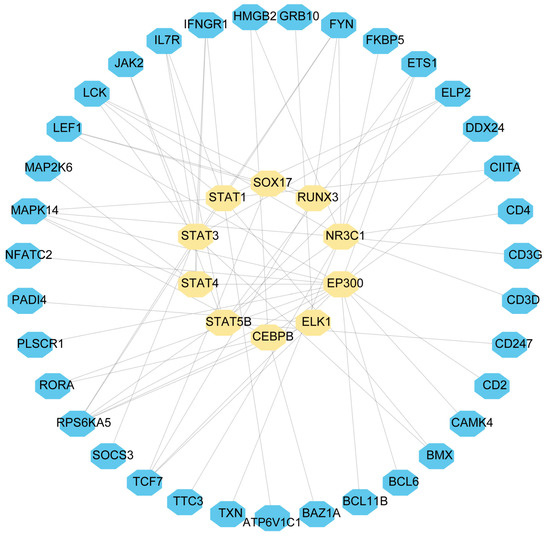 DEGs-TF were used as nodes in an interconnected regulatory network. Light yellow hexagon nodes represent TFs, and genes interact with TFs as blue hexagon nodes.