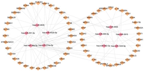 DEGs and miRNAs interact to regulate gene expression. The miRNAs are represented by pink diamond patterns and DEGs are represented by orange diamonds.