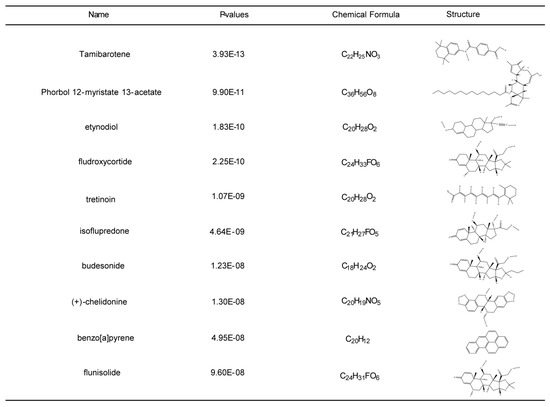 Top ten potential drugs were selected by Enrichr composite score. Ten drug names, p-values, molecular formulas, and two-dimensional structures are shown.