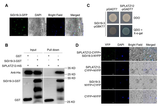 First, we created SiDi19-3-green fluorescence protein (GFP) transgenic hairy roots of foxtail millet. The GFP signal was particularly observed to be merged with the 4′,6-diamidino-2-phenylindole (DAPI) dye, indicating the nuclear localization of SiDi19-3 in the transgenic hairy roots. We then examined whether SiDi19-3 and SiPLATZ12 interacted. Yeast cells co-transformed with the SiPLATZ12-AD and SiDi19-3-BD constructs were able to grow in a synthetic medium deficient in Trp, Leu, His, and 25 mM AbA (aureobasidin A) (quadruple dropout [QDO]), indicating the physical interaction between SiPLATZ12 and SiDi19-3 in yeast cells (Figure 1B). In the pull-down assays, SiPLATZ12-His could be pulled down by SiDi19-3-GST but not by GST alone (Figure 1C). Bimolecular fluorescence complementation (BiFC) assays were carried out. The YFP signal was observed using a confocal microscope when SiPLATZ12 fused to C-terminus of YFP (SiPLATZ12-CYFP) and SiDi19-3 fused to N-terminus of YFP (SiDi19-3-NYFP) were co-transformed into tobacco epidermis cells; however, no YFP signals were observed when SiPLATZ12-CYFP and NYFP, SiDi19-3-NYFP, and CYFP, or NYFP and CYFP were co-transformed (Figure 1D). The YFP signal could also be merged with the DAPI dye. These findings indicate an interaction between SiDi19-3 and SiPLATZ12.