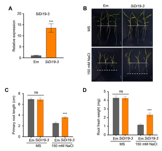 Under the control of the 35S promoter, the full-length CDS of SiDi19-3 was amplified and cloned into PROKII vector. Based on an earlier study [39], the recombinant plasmid was transformed into A. tumefaciens K599. Positive transformants were inoculated into 20 mL of liquid solution and cultured with continuous shaking for 12 h. The culture was then centrifuged at 6000× g for 5 min. Subsequently, the cells were resuspended in 1/2 MS liquid medium to a final concentration with OD600 = 1.0. Three-day-old shoot tips were cut and incubated with A. tumefaciens containing 35S::SiDi19-3 or the empty vector at 28 °C for 10–20 min with continuous shaking. The transformed shoot tips were transferred onto 1/2 MS solid medium supplemented with 100 mg/L timentin overnight to induce root formation [39]. Approximately 7 d later, transgenic hairy roots were confirmed using RT-qPCR. Twenty transgenic seedlings were transferred into 1/2 MS liquid medium with or without 150 mM NaCl for an additional 7 d. The phenotype was photographed, and root length was measured. Three biological replicates of each experiment were performed.
