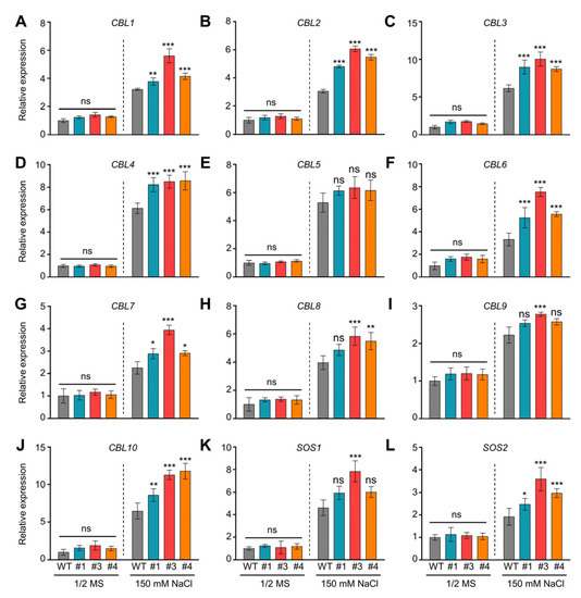 Salt stress affects physiological factors such as plant growth, development, and yield [1,2,3]. Plants acquire various molecular, biochemical, and physiological responses to tolerate salt stress [1]. Re-establishing ionic equilibrium to enhance salt tolerance is a crucial process for plants [4]. Additionally, the salt overly sensitive (SOS) pathway plays an important role in the response to salt stress in plants. The plasma membrane-localized Na+/H+ antiporter SOS1 and its regulatory proteins, including SOS2 (a protein kinase, also known as CIPK24), SOS3/calcineurin B-like protein 4 (CBL4), and other CBL proteins, maintain this process [5,6,7,8]. Under salt stress, SOS3 and CBL10 collaborate in the roots and shoots to detect the rise in cytoplasmic calcium and transmit this signal to the downstream serine/threonine protein kinase SOS2. Subsequently, SOS2 phosphorylates SOS1 to enhance Na+/H+ exchange activity and improve plant salt tolerance [1,3]. Simultaneously, tonoplast-localized Na+/H+ antiporters (NHXs) that sequester Na+ within vacuoles also play vital roles in re-establishing ionic homeostasis under salt stress [9,10]. Loss of function of SOS and NHX genes results in hypersensitivity to salt stress owing to high Na+ accumulation in the cytosol. In contrast, overexpression of the products of these genes improves salt tolerance owing to the low Na+ accumulation in the cytosol.
