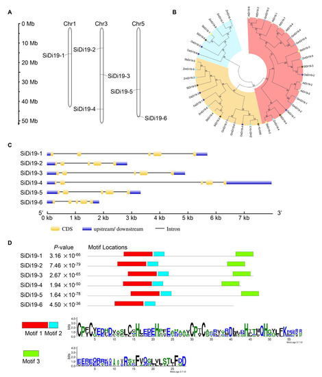 Analysis of SiDi19 genes in foxtail millet. (A) Distribution of SiDi19-3 genes on the chromosomes of foxtail millet. (B) The tree was reconstructed based on the highly conserved zf-Di19 domain of Di19 proteins in Setaria italica, Oryza sativa, Arabidopsis, Sorghum bicolor, and Zea mays. Bootstrap values from 1000 replicates are indicated at each node of the branches. (C) Gene structures of six SiDi19 genes in foxtail millet created at GSDS website. (D) Conserved motif analysis according to multiple sequence alignments of SiDi19 proteins using the MEME website.