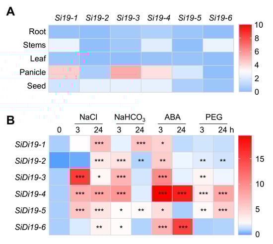 Next, using quantitative reverse transcription polymerase chain reaction (RT-qPCR) analysis, we examined the transcriptional levels of SiDi19 genes in various organs. SiDi19-1, SiDi19-4, and SiDi19-6 indicated higher transcript levels in stems than other members of the gene family, whereas SiDi19-2, SiDi19-3, and SiDi19-4 were preferentially expressed in seeds (Figure 7A). Furthermore, SiDi19-1, SiDi19-3, and SiDi19-4 indicated higher transcript levels in the panicles than other plant parts. All six SiDi19 genes had low transcript levels in the roots and leaves. These gene expression patterns in different tissues suggested that some members may function redundantly at different developmental stages.