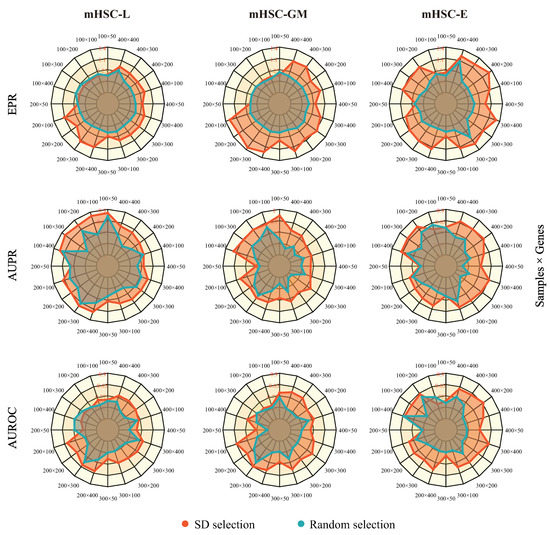 In this section, we present the results of the robustness of MetaSEM in different data scales. We first set the sampling points according to the standard deviation of gene expression and sample size. Then, we built sub-datasets using mHSC-L, mHSC-E, and mHSC-GM. In addition, we also created another dataset of the same points through random selection as a reference. We used the same hyperparameters and five-fold cross-validation during model training. As shown in Figure 2, the red area is larger than the blue area. The fluctuation range of the model on the three metrics was 11.5%, 15%, and 30.7%, respectively. This is because genes with a large number of 0 expression values also had a lower standard deviation. This means that removing these genes would reduce the sparsity of scRNA-seq data. By comparing the two gene selections, we found that the degree of data dispersion is an essential feature.