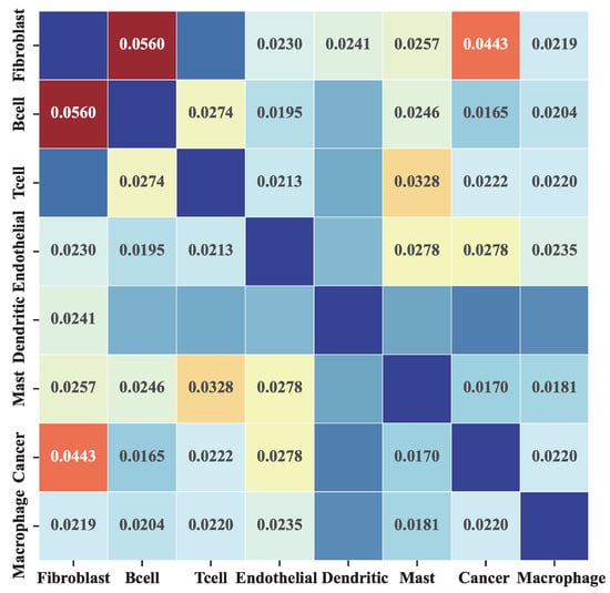 To verify whether MetaSEM captures specific information, we analyzed the inferred GRN and gene expression data. We generated the cell-type-specific GRN based on eight HNSCC sub-datasets. Figure 3 shows the heatmap of the Pearson correlation coefficient between the different GRNs. In this matrix, two observations are made. First, the average correlation coefficient is less than 0.1, which indicates that the inferred GRNs have a very low correlation. Second, as shown in the cancer row, the highest correlation coefficient is Fibroblast. There are two reasons for this: the cancer dataset contains some cancer-associated fibroblasts (CAFs) [24], and the correlation between Fibroblast and Cancer subsets is the highest, which corresponds to the findings of [25].
