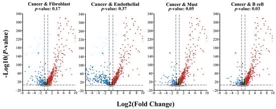 The divergence of gene expression on different cell types. The red dot represents the genes with a positive correlation, the blue dot represents the genes with a negative correlation, and the black dot represents the gene with no difference in expression level. The grey dot represents the gene below the threshold.