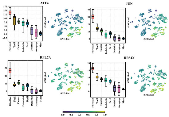 Next, we analyzed how MetaSEM extracts regulators. When sorting out the output of the GRN Layer, we found that the regulatory weight of some genes was very high. Therefore, we collected the regulatory weights of these genes. The boxplots in Figure 5 show the results. These genes had higher regulatory weight in Fibroclast, T cell, Cancer, and Endothelial. As shown in the t-SNE plots of Figure 5, the selected genes had significant weight distribution on different samples. The log2 (transcripts per kilobase per million (TPM) + 1) of ATF4, JUN, RPL7A, and RPS4X on HNSCC cells were 8.1, 6.5, 6.8, and 9.8, respectively. Finally, we selected ATF4, JUN, RPL7A, RPS4X, and other genes as regulators through cross-comparison.