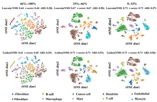 In order to verify the importance of the regulatory weight of cell-type recognition. We collected the cell types’ SEM matrix for each gene’s regulatory weight. Then, all genes were divided into three equal parts according to the regulatory weight for cell clustering. Then, we used the Louvain and Leiden methods to cluster cell types. As shown in Figure 7, the effect of clustering positively correlated with regulatory weight. The performance of the clustering methods on normalized mutual information (NMI), v-score, and adjusted rand index (ARI) proved this point.
