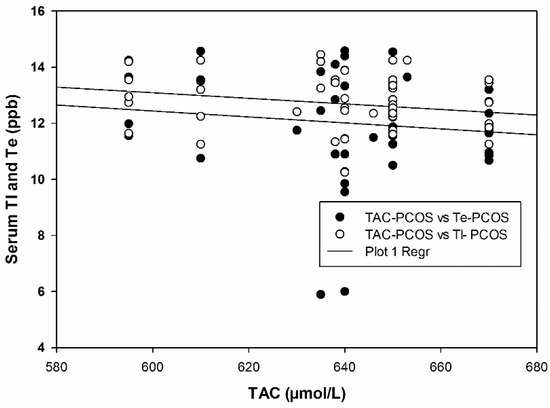 Rapid industrialization, urbanization, use of domestic/agricultural metallic compounds, and other anthropometric activities across the world have resulted in an undesirable impact on public health, mainly due to pollution from toxic heavy metals [1,2]. Women exposed to exogenous environmental heavy metals are susceptible to health risks since minute exposure to such toxic metals may give rise to reproductive dysfunction [3,4]. Exposure can occur via contaminated water, food, and soil contact. Toxic metals can be detrimental to pregnant women and those at reproductive age by inducing hormonal changes, altering menstrual cycles, ovulation, and female fertility [5,6]. Heavy metals and non-essential metals belong to a class of Endocrine Disruptor elements (EDE) and are considered reproductive toxicants [7]. Amongst the serious reproductive anomalies, Polycystic Ovarian Syndrome (PCOS) has emerged as one of the leading causes of infertility, with a global prevalence of about 4 to 21% [8]. PCOS is an endocrine disorder characterized by chronic anovulation, menstrual abnormalities, hyperandrogenism, hyperinsulinemia and polycystic ovaries [9,10]. Regardless of intensive and systematic investigations in this field, most PCOS cases are obscure with unidentified causes. Currently, metal ions are considered to be a possible risk and an etiological factor underlying PCOS, and are gaining interest. Variation in the serum levels of heavy metals has been linked to PCOS [11,12,13], but with unresolved etiologies. However, several studies have demonstrated oxidative stress as a major causative factor of the toxicity and carcinogenicity of these toxicants [14,15,16,17]. Total antioxidant capacity (TAC), antioxidant activity and oxidative stress marker levels reflect the extent of oxidative damage in a biological system. TAC reflects the ability of cells to quench free radicals, thus providing protection from the detrimental effects of these radicals. TAC is affected by the alteration in levels of free radicals or antioxidants in blood [18].