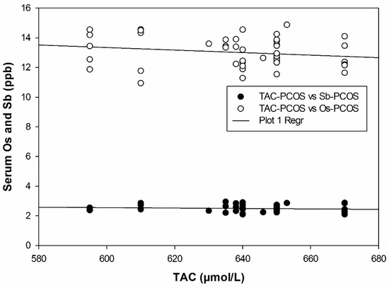 Sb is an important element, is a silvery white metal with numerous industrial applications, and is released to the environment as a result of many natural discharges. Commonly, people are exposed to Sb, which is present in the pentavalent form in serum and the trivalent form in red blood cells. An average intake of about 5 μg of Sb/day from food and water has been reported [25]. Recently, Komarova et al., 2021 investigated heavy metal levels in the blood of the adult population of Queensland, Australia where Sb levels were detected in plasma at a concentration of 4 µg/L [40]. Pneumoconiosis, chronic bronchitis, chronic emphysema, and respiratory irritation after chronic exposure to antimony trioxide and/or pentoxide dust have been recorded [41]. Sb as a pro-toxic element, as evidenced by a report in which women working at an antimony metallurgical plant exhibited increased incidence of spontaneous abortions and disturbances in menstruation compared to controls [42]. Oxidative damage due to Sb toxicity has been studied previously. The increased serum Sb levels and the decreased TAC and antioxidant enzyme activities and increased generation of oxidative stress markers in PCOS patients in our study are in line with previous reports [26,42].