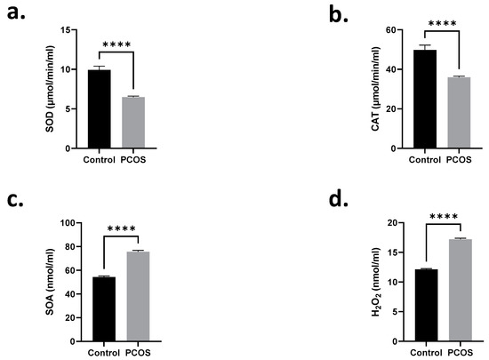Serum SOD and CAT enzyme activities are inhibited in PCOS patients. Means ± SEM of (a) SOD and (b) CAT activities and (c) SOA and (d) H2O2 levels. **** p < 0.0001.