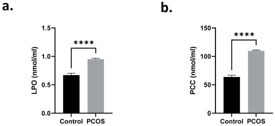 Serum LPO and PCC are elevated in PCOS patients. Means ± SEM of (a) LPO and (b) PCC levels. **** p < 0.0001.