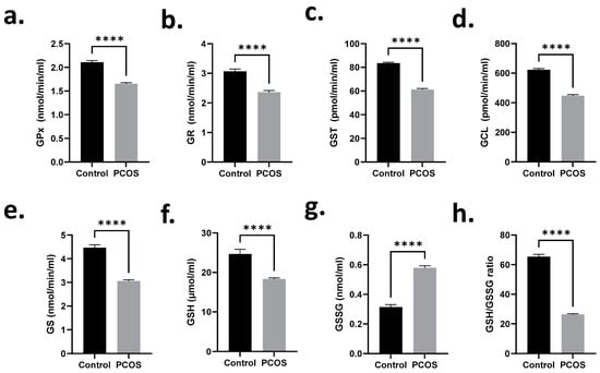 Glutathione homeostasis is disrupted in PCOS patients. Means + SEM of (a) GPx, (b) GR, (c) GST, (d) GCL, and (e) GS serum enzyme activities, levels of (f) GSH and (g) GSSG, and (h) GSH/GSSG ratio. **** p < 0.0001.