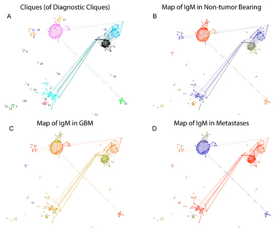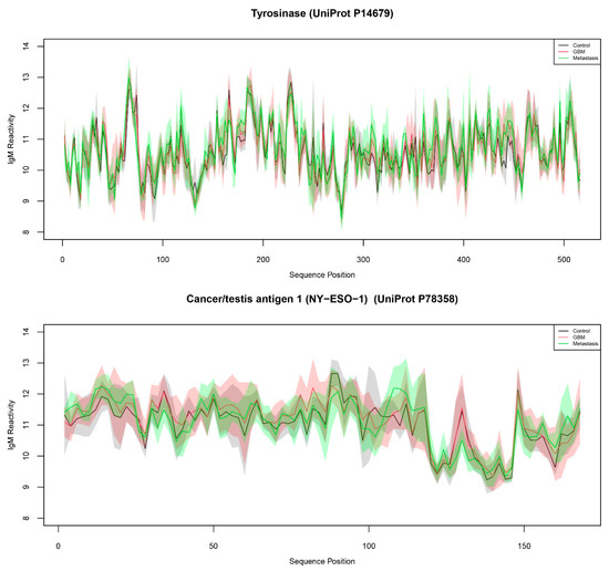 With these considerations in view, we previously argued that the repertoire of IgM may be an untapped source of biomarkers [8,26]. It was shown that libraries of mimotopes of public IgM specificities found in the blood of healthy donors may serve as a source of probes to construct diagnostic profiles of IgM reactivities [8,27]. As a proof of principle, such profiles were found to differentiate glioblastoma multiforme (GBM) patients from patients with brain metastases or non-tumor patients. Although peptide mimotopes are structurally interpretable, relating them to actual specificities may be difficult especially in a context of polyspecificity. To gauge the interpretability of IgM reactivity profiles to linear sequences from actual TAA, here we use a similar experimental setting with a commercial planar tumor antigen peptide microarray (PEPperPRINT®, Heidelberg, Germany). It contains a sequence set derived from 20 whole-length human proteins known to be TAA as well as 209 viral linear B cell epitopes related to malignancies. Confirming the expected low interpretability of IgM reactivities with self-antigens in the terms of adaptive responses, our results nevertheless identify patterns of IgM reactivity, which generally classify brain tumors. The interpretability of this differential IgM reactivity was found in terms of classes of polyspecificity, mapped using a reactivity graph, and perturbations of the IgM antibody levels.