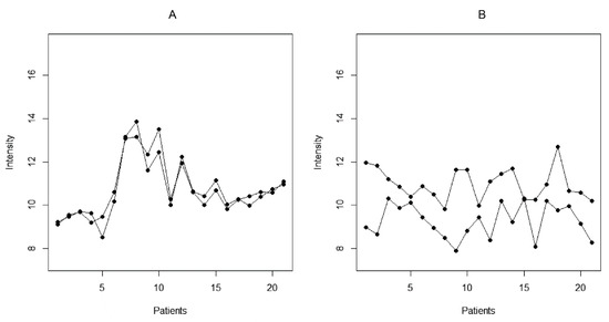 Rarely has IgM reactivity been used to extract diagnostic reactivity profiles. In mice, IgM reactivity to a set of autoantigens provided more consistent tumor-related patterns than IgG [11,38,39]. Stafford et al. (2016) demonstrated that IgM immunosigantures to random peptides were more consistent than IgG, both inter individually and in time, which was interpreted in favor of IgG as a richer source of information [9]. The opposite argument stresses the necessity of antibody repertoire profiles to be sufficiently consistent and relatively independent of the individual’s immunological history in order for them to be sources of generalizing classifiers or predictors of phenomena in the internal environment. Even just for IgM, we observed such a diversity of IgM reactivity that sets of patients’ sera, which differed by only 2/21 cases (in LOOCV), selected different sparsely overlapping feature profiles for the same classification task. From 267 unique features found in any of the 21 LOOCV sets, only 48 (18%) were common for five or more sets and none was common for all 21 sets. Previously, we found a similar variability in the diagnostic profiles when using a library of peptide IgM mimotopes [8].