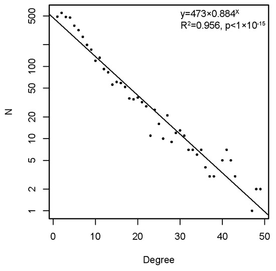 The graph, thus constructed, had 4512 vertices and 77,914 edges. The diameter of the graph—the shortest path between the farthest vertices without edge weights, was 12. The graph consisted of a large connected component of 4455 peptides and 52 disconnected peptides as well as three pairs unrelated to the rest. The vertex degree (number of neighbors) had an exponential distribution, which is a property of networks evolving by random attachment (Figure 4) [28]. Table 1 contains the ranking of the proteins and epitopes studied by modularity (clustering of vertices with more edges within the clusters than between the clusters) in the reactivity graph. It shows the relatedness of the reactivity profiles of the linear epitopes in each protein. The collection of diverse viral epitopes as a group was quite separate from the self-epitopes as a class of reactivities. Overall, a highly connected graph of IgM cross-reactivity was obtained with a set of 4512 peptides and 21 individual sera. The visualization of the graph was calculated using the Force Atlas 2 algorithm in Gephi software (Figure 5) [29].