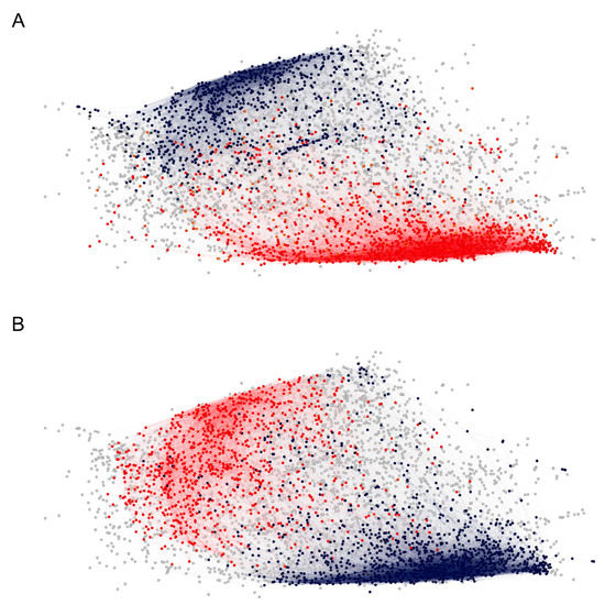 The two dense clusters of reactivity profiles appear to correlate with ABO blood group antigen expression, (A) vertices for which the neighborhood-averaged profiles show higher (red) or lower (blue) mean reactivity in patients carrying blood group antigen A. (B) The same as (A) for patients carrying blood group antigen B.