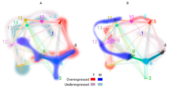 The layout of the graph was constrained to two dimensions, and in view of its high connectivity, significant topological information could be lost. Indeed, a hierarchical recursive Louvain clustering and subsequent optimal tree cutting yielded 15 clusters (communities) with higher edge density within than between the clusters (Figure 7A). Fourteen of the 15 clusters were in the large component of the graph, and the fifteenth represented the disconnected peptides. The color-coded representation of the clusters showed a significant overlap of distinct clusters in the middle of the layout used. To better define the topology, the pairwise modularity measure between each two clusters was used as a dissimilarity measure to construct a weighted graph of the 14 connected clusters (Figure 7B,C). Following the topological data analysis (TDA) concept of filtration, by changing the threshold of the modularity, a series of graphs was produced, which were examined for the occurrence or disappearance of cycles—closed paths [30]. A large cycle was observed to appear early (at low modularity) and disappear late (at high modularity), corresponding, in topological context, to a persistent homology. Simplifying the TDA approach, a large “hole” in the graph topology was observed, which was not evident from the layout used. Arranged around it were the clusters 5, 6, 8, 9, 11, 14, and 10 (Figure 7B). Another layer of the topology was formed by cluster 7, which spanned the whole layout being connected mostly to clusters 8, 9, and 12. It is important to note that the notion of (dis)connectedness in this TDA approach was relative, meaning that it depended on a threshold of the modularity between the clusters. Thus, cluster 7 was connected weakly all the way to clusters 6 and 5 and even with a couple of edges to 4 (Figure 7C).