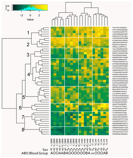 Biclustering heatmap plot of the patients’ IgM reactivities with the classifier profile of 51 peptides separating the three diagnostic groups. The profile provides a good clustering of both patients by diagnostic group and of peptides that fall into eight clusters. Only cluster 5 contains reactivities that were significantly increased in tumor-bearing patients, while the reactivities in clusters 1, 4, 6, 7, and 8 tended be lost in one or both of the tumor-bearing patient groups. Interestingly, clusters 1, 3, 6, and 7 distinguished two groups in the GBM group, which correlate with sex while sex was not used as a parameter in the feature selection.