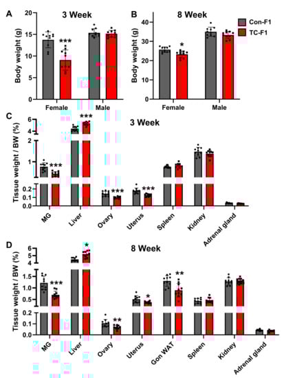 Early-life TC exposure lowers body weight and reproductive organ weight of F1 female offspring. (A,B) Body weights of 3-week-old (A) and 8-week-old (B) F1 male and female offspring. (C,D) The ratio of tissue weight to body weight of 3-week-old (C) and 8-week-old (D) female F1 offspring. Con-F1: F1 generation of the control group. TC-F1: F1 generation of TC exposure group. n = 10. Data are expressed as mean ± SEM. * p < 0.05, ** p < 0.01, *** p < 0.001 vs. Con-F1.