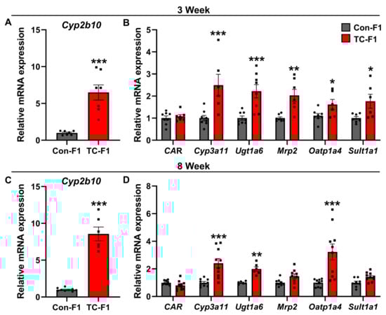 Accumulating evidence illustrates that the activation of CAR by environmental pollutants induces the hepatic expression of genes involved in drug metabolism, leading to epigenetic imprinting that permanently influences health-relevant phenotypes in later life. This prompted us to examine whether CAR-mediated hepatic induction would be transmitted to the F1 generation. In agreement with previous research [,,], we found that the CAR target gene Cyp2b10 was markedly increased in the livers of the 3-week-old offspring of TC-F1 females (Figure 2A). Additionally, upregulated mRNA expression of hepatic Cyp3a11, Ugt1a6, Mrp2, Oatp1a4 and Sult1a1 was seen in the female offspring of the TC-F1 group at 3 weeks after birth compared with the control group (Figure 2B). Consistently, we also found a robust Cyp2b10 induction in the livers of 8-week-old F1 adult offspring of maternal TC-exposed females (Figure 2C). Similarly, elevated gene expression of hepatic Cyp3a11, Ugt1a6, and Oatp1a4 in the TC-F1 group was also found in the 8-week-old female offspring (Figure 2D). In contrast, no statistical differences in the mRNA expression of hepatic CAR, Mrp2 and Sult1a1 were observed between the TC-F1 group and the Con-F1 group in female offspring (Figure 2D). These findings indicate that the activation of CAR through TC exposure in early life is sufficient to alter the expression of drug metabolism in adolescent age and may exert health-relevant effects on F1 offspring.