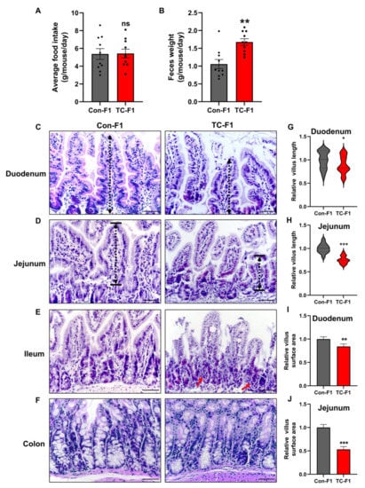 Maternal TC exposure affects small intestinal morphology in 8-week-old F1 female mice. (A) Average daily food intake of 8-week-old F1 female mice. (B) Average daily fecal production of 8-week-old F1 female mice. n = 10. (C–F) Representative HE images of the duodenum (C), jejunum (D), ileum (E), and colon (F) of 8-week-old offspring female mice. Black dashed lengths represent intestinal villi lengths and red arrows represent inflammatory cell aggregates. Scale bar = 50 μm. (G,H) Relative duodenal (G) and jejunal villus length (H). (I,J) Relative villi surface area of the duodenum (I) and jejunum (J). Data are presented as mean ± SEM. * p < 0.05; ** p < 0.01; *** p < 0.001 vs. Con-F1.
