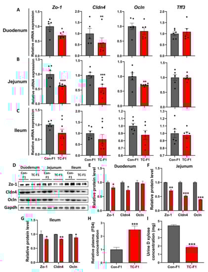 The intestinal epithelial barrier plays a crucial role in the absorption and utilization of nutrients, as well as in defense against environmental stimuli [,]. Attempting to understand the mechanisms responsible for nutrient malabsorption in TC-exposed offspring, we assessed the expression of crucial genes associated with intestinal barrier functions of the 8-week-old female offspring. The results showed that mRNA levels of Zo-1 and Cldn4 were significantly downregulated in small intestine (duodenum, jejunum and ileum) samples of the TC-F1 group (Figure 4A–C). Notably, the mRNA levels of Ocln were significantly decreased in the jejunum of offspring after maternal TC exposure (Figure 4B). Differently, mRNA levels of other genes (Ocln and Tff3) were not statistically different in the duodenum and ileum (Figure 4A,C). Similarly, no difference in mRNA expression of Tff3 was found in the jejunum (Figure 4B). Interestingly, Zo-1, Cldn4 and Ocln protein levels in small intestine samples also showed consistent findings (Figure 4D–G). Furthermore, macromolecular permeability, as demonstrated by increased mucosal-to-serosa transport of 4 KDa FITC-labeled dextran, was elevated in the TC-F1 group (Figure 4H). Additionally, the concentration of D-xylose in urine was markedly decreased in the TC-F1 group (Figure 4I), indicating that the barrier of intestinal mucosa was significantly impaired. Together, these findings indicate that TC exposure in early life could affect the intestinal barrier function of offspring, which may interfere with nutrient absorption in the small intestine, resulting in poor health outcomes in the offspring.