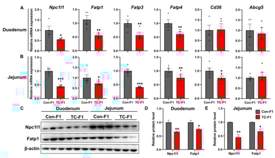 As we showed that maternal TC exposure induced intestinal barrier impairment related to nutrient malabsorption, we further found that the TG levels of 8-week-old female offspring in serum had an obvious down-regulation in the TC-F1 group (Table 1). Based on these findings, we hypothesized that weight loss in TC-exposed female offspring is associated with active impairment in lipid absorption. Accordingly, we sought to further investigate whether TC-exposed offspring exhibit impaired lipid absorption and to determine the mechanisms involved. Given that the distal part of the duodenum and the upper part of the jejunum serve as the crucial site of lipid absorption, we focused on the expression of lipid absorption marker genes in these two intestinal segments. As seen in Figure 5A, decreased mRNA expression of Npc1l1, Fatp1, Fatp3 and Fatp4 was observed in the duodenum of the TC-F1 group, whereas the expression of Cd36 and Abcg5 was not statistically different. Notably, except for gene Abcg5, the expression of which was not influenced by TC exposure, the expressions of the other five genes (Npc1l1, Fatp1, Fatp3, Fatp4 and Cd36) were significantly decreased in the jejunum of the TC-F1 group (Figure 5B). Further confirming this observation, we next examined the protein expression levels of Npc1l1 (a protein that regulates cholesterol absorption) and Fatp1 (a fatty acid transporter protein). As expected, significantly lower protein levels of Npc1l1 and Fatp1 were observed in the duodenum and jejunum in the TC-F1 groups (Figure 5C–E). Taken together, our data indicate that TC exposure in early life could result in a decreased ability of offspring to absorb lipids in the intestine, which would be associated with the restricted expression of genes involved in regulating intestinal lipid transport.