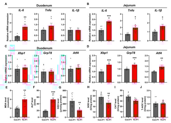 We next asked about the mechanisms behind decreased lipid absorption within the small intestine in the TC-F1 group. Obtained results have shown that structural damage to the intestinal mucosa and abnormal lipid absorption often result from the dysregulation of the expression of relevant inflammatory cytokines or the promotion of oxidative stress in the intestine [,,,,,]. Therefore, we characterized the levels of inflammation and oxidative stress in the intestine of the offspring of both groups. As shown in Figure 3C, no significant inflammatory cells were found in the duodenum and jejunum in H&E staining. However, we observed a marked increase in the mRNA levels of IL-6 in the duodenum and jejunum of the TC-F1 group (Figure 6A,B). Additionally, the mRNA levels of Tnfα and IL-1β in the jejunum were also significantly up-regulated in the TC-F1 group (Figure 6B). In contrast, no statistical difference was found in Tnfα and IL-1β mRNA expression in the duodenum in the TC-F1 group (Figure 6A). These results suggest that TC exposure in early life could lead to slight inflammation in the offspring intestine, especially in the jejunum. Numerous studies have revealed that intestinal inflammatory injury is tightly linked to oxidative stress [,,,,,]. In our previous results, we found a significant increase in serum ALT levels in the TC-F1 group (Table 1). In addition, the serum levels of AST showed an increasing trend and did not have a statistical difference in the TC-F1 group (Table 1). It is well known that elevated ALT and AST activity is not only a sign of abnormal liver function, but also a key marker of stress response [,,]. Accordingly, we next focused on oxidative stress-related markers. Our results showed that the mRNA expression of Xbp1, Grp78 and Atf4, the target genes associated with oxidative stress, were not significantly different in the duodenum of the TC-F1 group compared with the control group (Figure 6C). However, these three target genes were markedly upregulated in the jejunum (Figure 6D). This result is consistent with the expression of inflammatory factors, implying that TC exposure led to more pronounced oxidative stress induced in the jejunum of F1-generation female mice in response to environmental stress. We further examined biochemical markers associated with oxidative stress in the jejunum. We found that the levels of MDA (Figure 6E) and ALP (Figure 6F) were considerably upregulated in the jejunum of the TC-F1 group compared with the control group. However, the levels of GSH (Figure 6G) and SOD (Figure 6H) were remarkably down-regulated, and there were no significant differences in CAT (Figure 6I) and T-AOC (Figure 6J). These results suggest that TC exposure in early life may affect the levels of MDA, ALP, GSH and SOD in the offspring jejunum, leading to oxidative stress in the jejunum.