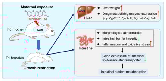 As described by the Developmental Origins of Health and Disease (DOHaD) theory [], extremely slight environmental changes during vital developmental windows could permanently alter the tissue structure, physiological function, and metabolism of offspring. There is growing concern about the effects of prenatal, in utero, or lactational maternal environmental chemical exposures on the next generation. However, the effects of maternal TC exposure on the offspring’s health remain uncertain. Accordingly, in the present study, we mainly assessed changes in body weight, hepatic drug-metabolizing enzymes, and intestinal tract in the F1 generation of maternal exposure to TC. We hope that the results presented below will increase the understanding of the effects of maternal exposure to TC during pregnancy and lactation on the development of the offspring. More importantly, this work would provide new insights into the association between the toxic effects of CAR-targeted environmental chemicals and offspring health.