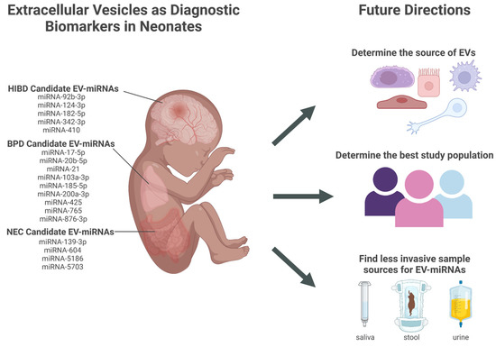 Overall, EVs have a remarkable potential to contribute to our understanding of pathologic processes and aid in biomarker discovery for commonly encountered conditions in premature neonates, including NEC, BPD, and HIBD. There are many opportunities in this field for further characterization of EVs and EV-miRNAs and how they function in such conditions and to address their translation to clinical settings. These include determining how EV heterogeneity affects diagnostic accuracy and whether urine, feces, and saliva can provide a simple, noninvasive method of EV collection.