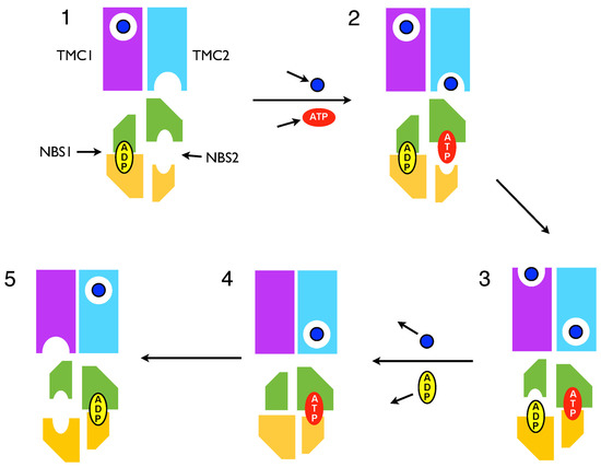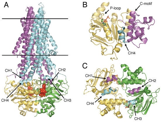 The NBD dimer structural configuration was first proposed by [21]. Subsequent crystal structures confirmed this NBD “sandwich” dimer with ATP binding sites at the intermonomer interface, opposed by the Walker A and B sequences of one monomer and the C-motif of the opposite monomer. These composite ATP-binding sites are referred to as nucleotide binding sites (NBSs) [21,22] (Figure 1C).