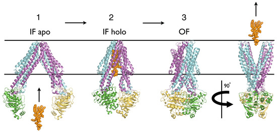 Notwithstanding their diversity, the TMD structures are generally construed to form a transmembrane conduit that alternates between inward- and outward-facing conformations. Thereby, the putative channel is, in most cases, accessible from only one or other side of the membrane during a transport cycle [7,25,26,27], in line with the original Jardetzky allosteric model [28].