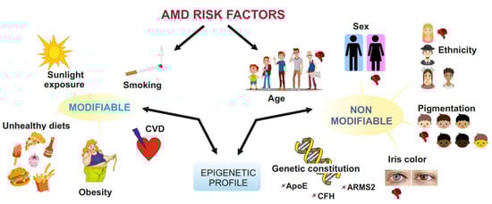 Risk factors for age-related macular degeneration. They can be divided into non-modifiable and modifiable factors. Ageing is per definition the most serious AMD risk factor, and smoking is the most consistently reported modifiable risk factor. Mutations in the genes encoding regulators of complement H activity (CFH), apolipoprotein E (apoE) and age-related maculopathy susceptibility 2 (ARMS2) as well as collagen synthesis, lipid metabolism/cholesterol transport, receptor-mediated endocytosis, endodermal cell differentiation, angiogenesis, and extracellular matrix organisation have been reported to be associated with AMD in as many as 65% of cases. Other factors, such as European/North American ethnicity, white skin pigmentation, light iris color, unhealthy diet, cardiovascular diseases and obesity, and blue light originating mostly from sunlight are less well documented and more controversial, but it cannot be excluded that a combination of these factors may significantly increase AMD risk. Both modifiable and non-modifiable AMD risk factors are mutually dependent on the epigenetic regulation of gene expression, and this is mainly determined by the cellular epigenetic profile.