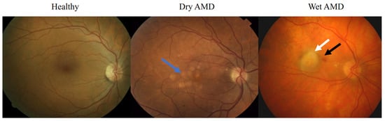 Fundus photographs from the macula area. Drusen is indicated by a blue arrow, retinal oedema with a white arrow, and a haemorrhage with a black arrow.
