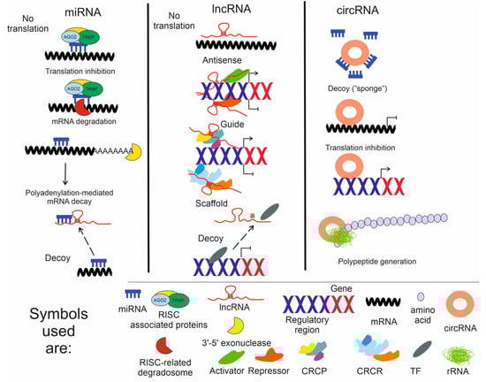 Only a small proportion of the human genome encodes for polypeptides/proteins, although these genes are transcribed to a much greater extent []. The human transcriptome can be understood in at least two ways: as the total RNA content of the cell or the complete set of mRNAs. In general, the RNA content of the cell can be divided into coding (mRNA, about 4% of the total RNA) and non-coding (ncRNA, the remaining 96%) RNAs. The latter can be further divided into housekeeping and regulatory ncRNAs. The former group comprises ribosomal RNAs (rRNAs) and transfer-RNAs (tRNAs). Regulatory ncRNAs include short non-coding RNA (snRNA, fewer than 200 nucleotides in length) and long non-coding RNA (more than 200 nucleotides). It is not the intent of this review to provide detailed information on classification and general properties of non-coding RNAs as that can be found elsewhere [,]. We will limit our considerations here to microRNAs (miRNAs), long non-coding RNAs (lncRNAs), and circular non-coding RNAs (circRNAs).