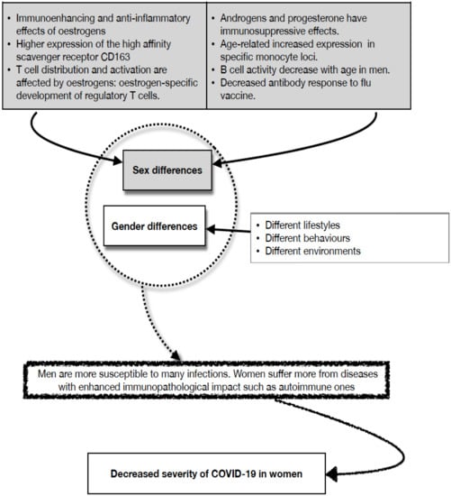In a previous paragraph, we have briefly discussed the pathophysiological differences between men and women that may influence COVID-19 outcome i.e., the role of biological sex. Differences in response to COVID-19 between men and women may be due not only to biological differences (i.e., sex differences) but also to the so-called “socially constructed sex” (i.e., gender differences) []. It should be emphasized that there is also a role for gender which determines different behaviours between men and women which might influence exposure to the virus with different impacts on the infection [,,,,,,,].