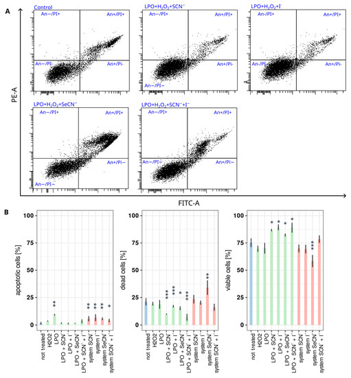 Figure 1. Influence of tested systems on HGF apoptosis. (A) Representative scattergrams of cell distribution after staining with the apoptosis assay kit. Each segment of the scattergram is labelled as: An−/Pi−—viable cells, unstained with either annexin V or propidium iodide; An+—apoptotic cells, stained with annexin V; An+/PI+—dead cells, stained with both annexin V and propidium iodide; PI+—stained with propidium iodide. (B) Bar plots show the percentage of apoptotic cells, dead cells, and viable cells after 1 h of treatment with tested systems. Colours indicate sample types where (i) blue denotes the control, (ii) green denotes an inactive LPO system (enzyme + (pseudo)halide), and (iii) red denotes an active LPO system. Asterisks indicate a statistically significant difference between a tested group and the control in the post hoc Tukey’s test—* p < 0.05; ** p < 0.01; *** p < 0.001.