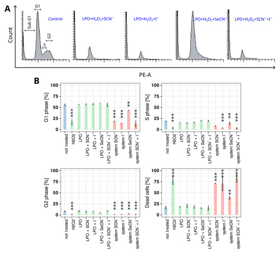 Figure 2. Influence of tested systems on the percentage of cells in each analysed cell cycle phase. (A) Representative histograms of cell cycle distribution in the control sample and samples treated with all tested active LPO systems. (B) Percentage (mean) of cells in each cell cycle phase. Colours indicate sample types where (i) blue denotes the control, (ii) green denotes an inactive LPO system (enzyme + (pseudo)halide), and (iii) red denotes an active LPO system. Asterisks indicate a statistically significant difference between a tested group and the control in the post hoc Tukey’s test—** p < 0.01; *** p < 0.001.
