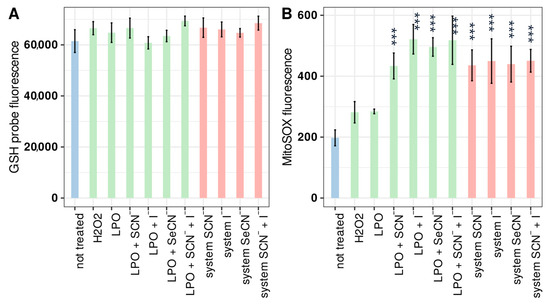 Figure 3. Influence of tested systems on (A) intracellular glutathione and (B) mitochondrial superoxide production in HGFs. In both cases, the bar describes the mean relative fluorescence of the cells after staining, which is proportional to the intracellular GSC concentration (A) and superoxide production (B). Colours indicate sample types where (i) blue denotes the control, (ii) green denotes an inactive LPO system (enzyme + (pseudo)halide), and (iii) red denotes an active LPO system. Asterisks indicate a statistically significant difference between a tested group and the control in the post hoc Tukey’s test—*** p < 0.001.