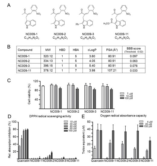 NC009 compounds. (A) Structure and formula of NC009-1, -2, -3, and -11. (B) Molecular weight (MW), hydrogen bond donor (HBD), hydrogen bond acceptor (HBA), calculated octanol–water partition coefficient (cLogP), polar surface area (PSA), and blood–brain barrier (BBB) permeation score of NC009 compounds. (C) Cytotoxicity of NC009 compounds against human HMC3 cells examined by MTT assay. Cells were treated with test compound (1–100 μM) and cell viability was measured the next day (n = 3). To normalize, the relative viability of untreated cells was set at 100%. (D) DPPH free radical scavenging activity on DPPH (10–160 μM) and (E) oxygen radical absorbance capacity (4–100 μM) of quercetin (as a positive control) and NC009 compounds (n = 3).