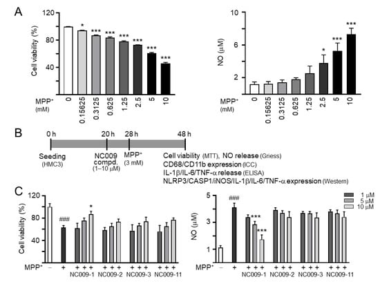 MPP+, the active neurotoxic metabolite of the parkinsonian toxin MPTP, inhibits complex I of the mitochondrial respiratory chain, inducing energy depletion and producing reactive oxygen species [20]. MPP+ induces mouse microglial N9 cell activation [21]. To investigate the effect of MPP+ on human microglial cells, different concentrations of MPP+ (0–10 mM) were added to HMC3 cells for 20 h. As shown in Figure 2A, MPP+ at a concentration range of 0.15625–10 mM significantly decreased HMC3 cell viability compared to no MPP+ treatment (p = 0.028−<0.001). Treatment of 2.5–10 mM MPP+ significantly increased NO release in culture medium (p = 0.019−<0.001), suggesting the occurrence of inflammatory response in human microglial cells. Based on these results, 3 mM MPP+ was selected to test anti-inflammatory potentials of NC009 compounds. HMC3 cells were pre-treated with NC009 compounds (1–10 µM) for 8 h before MPP+ (3 mM) addition for 20 h (Figure 2B). As shown in Figure 2C, NC009-1 at 10 µM significantly increased cell viability (from 63% to 87%, p = 0.012). In addition, NC009-1 at 5–10 µM decreased release of NO in cell culture medium (from 4.1 µM to 2.8–1.7 µM, p < 0.001). The observation of reduced expression of CD68 (from 131% to 111%, p = 0.010) and CD11B (from 135% to 107%, p = 0.002), markers of activated microglia [22], also displayed the anti-inflammation action of NC009-1 in MPP+-activated HMC3 cells (Figure 2D). The anti-inflammatory potential of NC009-1 at 10 µM were further supported by the reduced release of IL-1β (from 82 pg/mL to 35 pg/mL, p < 0.001), IL-6 (from 1020 pg/mL to 759 pg/mL, p = 0.003), and TNF-α (from 59 pg/mL to 25 pg/mL, p = 0.004) in cell culture medium (Figure 2E).