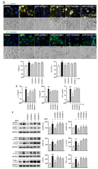 MPP+-induced inflammation of HMC3 microglia and anti-inflammatory potentials of NC009 compounds. (A) Cytotoxicity of MPP+ against HMC3 cells by MTT and NO release assays. Cells were treated with MPP+ (0–10 mM) and cell viability and NO release in culture medium was measured the following day (n = 3). To normalize, the relative cell viability in MPP+-untreated (inactive) cells was set at 100%. p values: comparisons between inactive and activated cells (* p < 0.05, *** p < 0.001). (B) Experimental flow chart. HMC3 cells were plated on day 1. After 20 h, cells were pre-treated with test compounds (1–10 μM) for 8 h, followed by MPP+ (3 mM) treatment for 20 h. On day 3, the HMC3 cells were examined for cell viability (MTT assay) and NO release (Griess assay) in culture medium. In addition, cells with 10 μM compound treatment were examined for CD68 and CD11B expression (ICC staining), IL-1β, IL-6, TNF-α release (ELISA), and NLRP3, CASP1, iNOS, IL-1β, IL-6, and TNF-α expression (Western). (C) Cell viability and NO release assays (n = 3). The relative cell viability in MPP+-untreated cells was normalized as 100%. (D) CD68 and CD11B expression (n = 3). Cells were analyzed by immunofluorescence using antibodies against CD68 (yellow) and CD11B (green). Cell nuclei were counterstained with DAPI (blue). (E) IL-1β, IL-6, and TNF-α release assays (n = 3). (F) NLRP3, CASP1, iNOS, CREB, IL-1β, IL-6, and TNF-α levels analyzed by immunoblotting using GAPDH as a loading control (n = 3). To normalize, protein expression level in MPP+-untreated cells was set at 100%. (C–F), p values: comparisons between MPP+-untreated and treated cells (# p < 0.05, ## p < 0.01, ### p < 0.001), or with and without compound addition (* p < 0.05, ** p < 0.01, *** p < 0.001).