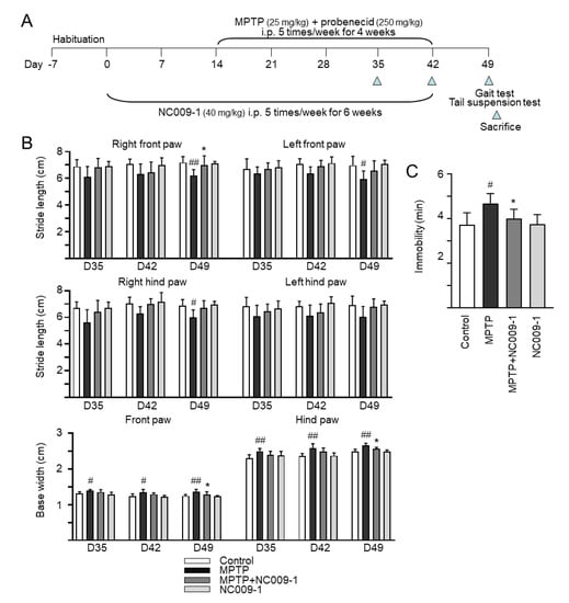 Neuroprotective effects of NC009-1 in MPTP-induced mouse model of PD. (A) Experimental protocol. After one week’s habituation, vehicle or NC009-1 (40 mg/kg) was i.p. administrated into control and MPTP groups or NC009-1 and MPTP+NC009-1 groups (n = 7) 5 times per week for 6 weeks. Two weeks after vehicle/NC009-1 administration, MPTP and MPTP+NC009-1 groups received i.p. injections of MPTP (25 mg/kg) along with probenecid (250 mg/kg) for 4 weeks (5 doses/week), while control and NC009-1 groups received injections of saline. Mice were subjected to gait test on days 35, 42, and 49, and tail suspension test on day 49. Next day, mice were sacrificed for HPLC, IHC (Figure 4), and Western (Figure 5) analyses. (B) Gait test to assess gait variability. Stride length (right front paw, right hind paw, left front paw, and left hind paw) and base width (front paw and hind paw) were measured as the distance between two paw prints. (C) Tail suspension test to assess immobility. Duration of immobility within 6 min was recorded. (B,C), p values: comparisons between MPTP and control (# p < 0.05, ## p < 0.01), or NC009-1-treated and untreated MPTP mice (* p < 0.05).